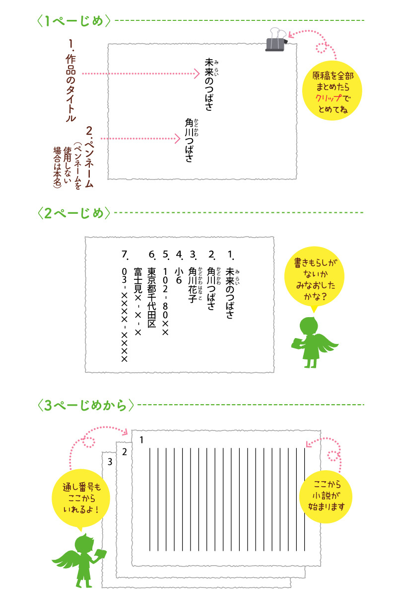 - パソコンで書いた原稿のばあいは、20字×20行のたて書きでプリントアウトした紙で応募してください(感熱紙不可)。