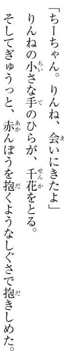 人間に戻った千方センパイが、モモたちを助けるために力を使いすぎて倒れちゃって・・・・・・。責任を感じて落ち込むモモたちを、ちいさいりんねちゃんが元気づけてくれたよ。