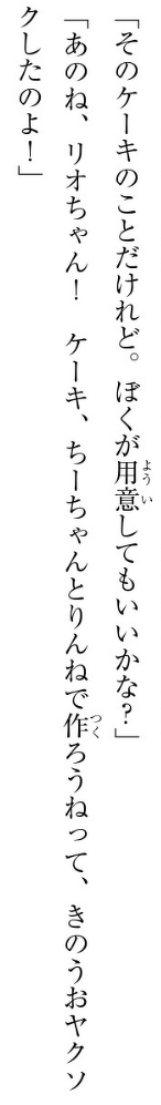 みんなでバレンタインパーティーの準備をすることになって、千方センパイとりんねちゃんはケーキをつくる係になったよ。
