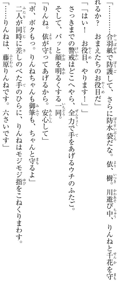 短編「やってきました、ミコトバの里!」で、千方センパイの力が宿った御筆「千花」と出会ったよ。