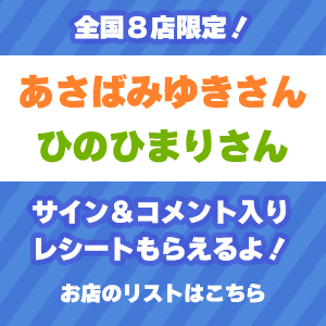 - あさばさんサイン入りレシート対象作品と、ひのさんサイン入りレシート対象作品を同時購入した場合、先にレジを取った作品の対象サイン&コメントがレシートに印字されます。あさばさん、ひのさん2人のサイン&コメントがほしい方は、それぞれの対象作品を分けてお会計をしてください。