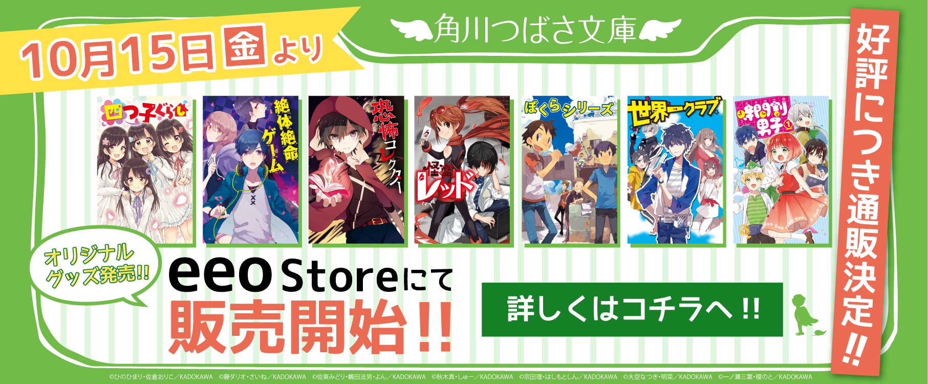 2021.10.15 編集部より 【通販スタート!】つばさ文庫オリジナルグッズ販売! 大好評だった「角川つばさ文庫オリジナルグッズ」の 通販での取り扱いがはじまったよ! ショップで購入できなかった人も、 これを機会に、ぜひゲットしてみよう!! グッズ化されたシリーズと、 各商品の内容は、以下からチェックしてね↓ (※商品の詳細は、外部サイトにご案内しております。) 各シリーズのグッズの内容はこちらから♪ 四つ子ぐらし 絶体絶命ゲーム 恐怖コレクター 怪盗レッド ぼくらシリーズ 世界一クラブ 時間割男子 それぞれの本についてもぜひチェックしてね♪