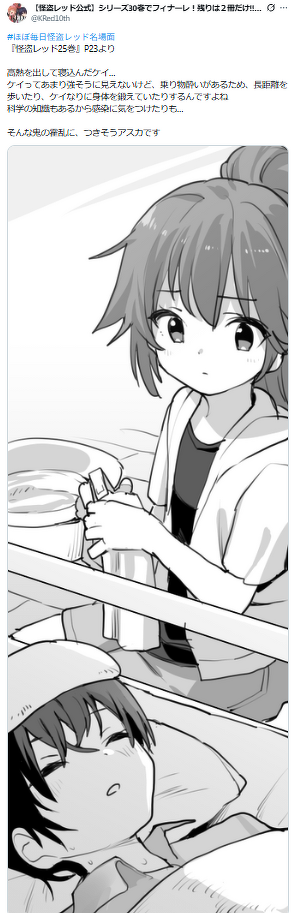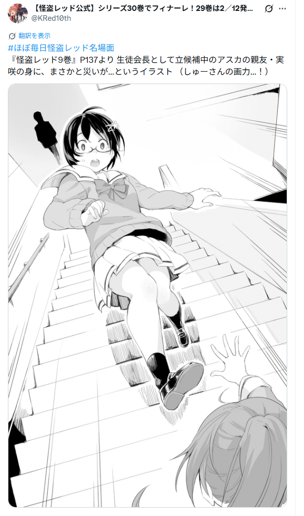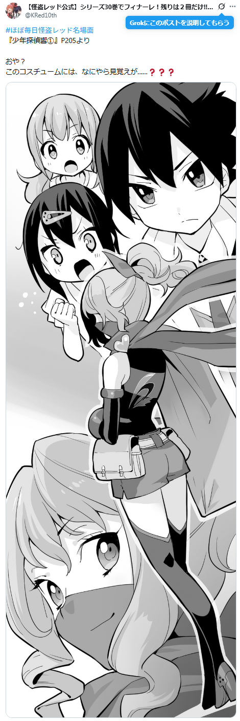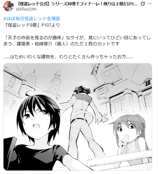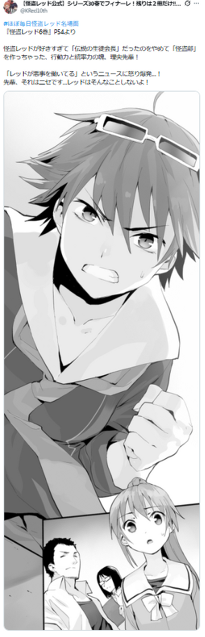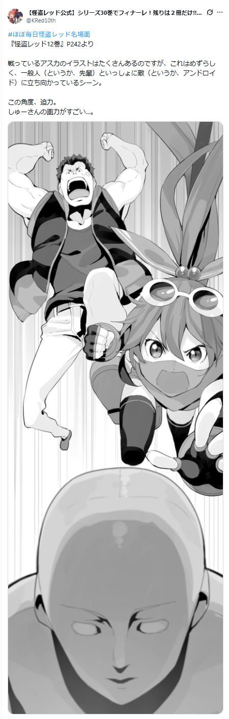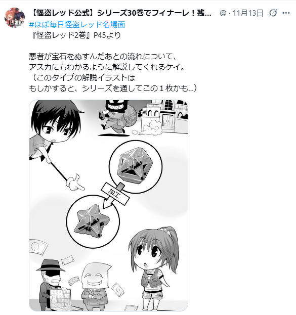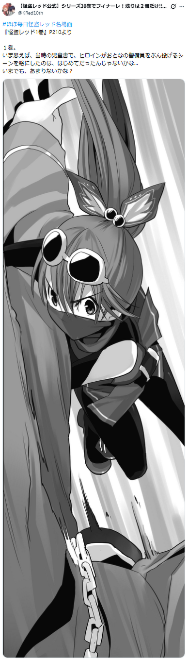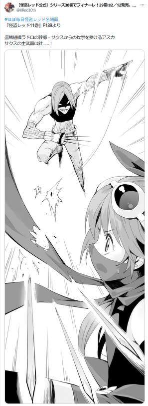 「#ほぼ毎日怪盗レッド名場面」というハッシュタグで、しゅーさんのイラストを1枚ずつ紹介しているよ。