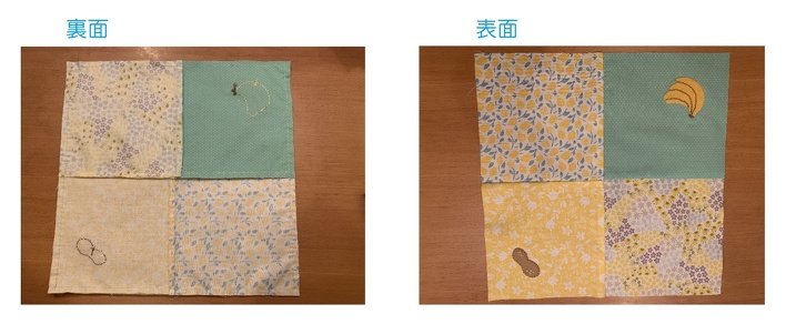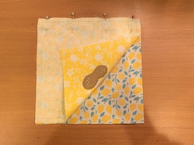 2枚のピースを中表(布の表を内側にすること)に合わせて、まち針を打ちます。